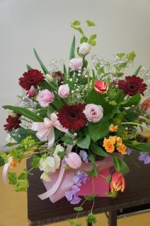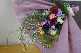 今週は特別企画で、チャリティーレッスンになりました。 生徒さんからいただいお花代の一部を国際子ども花基金に寄付させていただきます。 さらに!! 花の生産者さん、資材屋さんにも協力していただき花材と資材が通常の2倍!!! これはウレシイですね~。 これは中級さんのブーケ。 ユキヤナギとコデマリを長めに使い、流れるようなラインを作ってあります。 ラッピングペーパーは黒とピンクの2色使い、シックな雰囲気が丈が長めのこのデザインとよく合います。 この方は花材のすべてを花束には使わずに、お土産として少しだけ取っておいたようです。 残りはおうちでアレンジを作るのでしょうか。 とにかく花がたくさんありましたからそんな使い方もアリですね~。 こちらは初級さんの作品。 花束の花材をペーパーボックスの花器にアレンジしてあります。 2倍の花材のすべてを使って作ったビッグな作品でした。 直径が30㎝はあったでしょうか。 とにかく豪華でしたよ。 2倍の花材すべてを使ったビッグサイズに仕上げてもよし、半分に分けて2個作ってもよし、花束も花器アレンジもできるお得なレッスンでした。
