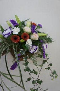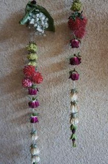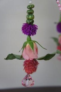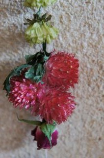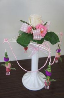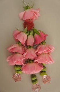 壁掛けにもできるバスケットにアレンジしました。 ホテルやレストラン、結婚式場にありそうなステキなデザイン。 私はもう何年もヨーロピアンで講師をしていますが、実は壁掛けタイプは初めてでした。 ありそうなのになかったこのタイプ。 生徒さんたちもとても喜んでしました ![]() 上級さんはタイのフラワーデザイナー、サクンさんのデザイン。 サクンさんのデザインは今年度の特別レッスンでしたがこれが最後となりました。 これまでははっきりとわかるアジアンテイストでしたが、今回は見た目はヨーロッパの雰囲気。 白のワイヤーフレームを使い、こちらも壁掛けにしたりタイトルのようにシャンデリア風に上からつるしたりして楽しむデザインです。 フレームの四隅には花に糸を通して作ったガーランドが釣るしてあります。 このガーランドの作り方の勉強会が去年のクリスマス前にあり、その時に作ったものを私はそのまま壁にかけて飾っていました。 それが今ではどうなっていると思いますか? しおれた?枯れた?腐った? いえいえ、何とこんなにきれいにドライフラワーになっているのですよ。 このドライフラワーのガーランド、とても評判が良いです。 我が家に来たお客さんは『本物の花?どうやって作ったの??かわいい』と言ってくれていますよ。 花首で切ってしまうのは花持ちが悪いし、だいたい花がかわいそうじゃないの!! と思う方も大勢いると思います。 特に日本では花を自然のままに楽しみたい、茎も葉っぱもついていて当然。 というのが一般的です。 ですが国や文化が違うとそうではないこともあり、花をデザインの一部として見たときに葉や茎は使わない方が美しいと言う場合もあります。 長く楽しむ、というよりも飾ったその時にもっとも美しく魅せる、といったところでしょうか。 サクンさんのデザインはこれまでレッスンをしてきたヨーロッパのデザインとはまったく違う雰囲気で私の教室では人気がありました。 もちろんデザインそのものも良かったと思うけど、花を通して日本との文化の違いを知る、そんな機会だったからではないかと思います。 来年度もこのようなお楽しみレッスンが用意されています。 みなさん、どうぞお楽しみに!! そして私も楽しみ~ ![]()