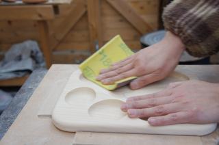 これらは夫と私とで作業工程を分担をして作っています。 まず夫が木を削りだし、器の形にします。 ここではバンドソーや木工旋盤などを使っています。 (その様子はまた今度紹介しますね) で、ここからが私の出番! “塗装”です。 まずはやすり掛け。 木工旋盤で削った椀などは夫が機械などを使って最終のやすりまでかけてあるのでやりませんが、ランチプレート類の仕上げは手作業なのです。 数種類のやすりを使ってできるだけきれいに仕上げていきます。 それから『FSC』の焼き印を押します。 *FSCとは国際的な森林認証のことです。 うちでは器の裏側に押していますがコレがけっこう難しいのよね ![]() 焼印を押す場所が平らでないとロゴがきれいに押せない。。。 ![]() なるべく平らな部分を探してはいるのだけど、いざ押してみたら文字の一部がなかったりなんてことも! しかも一度失敗すると消せないからそれはボツ ![]() 私はまだまだ焼印のプロにはなれないようです。 それから塗料を塗って行きます。 メイフラワーズでは塗料にもこだわり、数種類を重ね塗りして仕上げています。 まずは下塗り。 ここでは木の組織にしみ込んで木の水分と反応して木を固める作用のあるものを塗ります。 下塗りは5~8回ほど、しみ込み具合を見ながら塗り重ねて行きます。 次に中塗り。 これは耐久性を高めるためのもの。 最後に仕上げ塗装。 コレはイメージとしてニスを塗る感じかな(ニスではないからね!) 耐久性をさらに高めるのと見た目の美しさを出すために塗ります。 これも場合によっては2回塗ることもあります。 手間はかかるけどこうして塗り重ねる(しみ込ませる)ことで耐久性にも優れたものになって行きます。 中まで塗料が浸透しているので、器を使っているうちにもし傷がついたとしてもそこから水が入って変色したり、傷んだりということがありません。 そういえばずっと前にお手頃価格の(105円でした。。笑)木のスプーンを買ったことがあります。 見た目にはとてもステキだったのですが2回ほど洗っただけで塗料がはがれて白くなってしまいました。 今考えるとそのスプーンはきっと表面に塗膜を張っただけのモノだったのでしょうね。 私が担当している器の塗装。 こんな感じに作業をしています。 ちなみに。 塗装ではシンナー系のモノを使うので手袋もマスクも眼鏡もしっかりと着用でしています! いつも塗装作業はひとりでやっているので、家の裏でゴソゴソと何やら動いている怪しい人に見えているかもしれません ![]() メイフラワーズ木工部門も少しずつですが前進しています。 器の種類も増えましたし、おもちゃも含めて販売してくださる方が増えました。 器とおもちゃ以外でもいくつかお話をいただいています。 さらに春にはインターネットでの販売も始められるかも!! さぁどうなるメイフラワーズ!? 今は不安と期待が混じった、でもやっぱり私は期待や楽しみの方が多いかな、自分の気持ちもよくわかっていないそんな状態です(笑) みなさま、どうぞこれからもメイフラワーズをご贔屓に ![]() ![]() PR