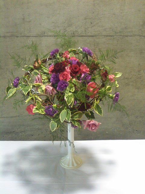 赤系の花材でしたが派手すぎず微妙な色合いのものが多く、ロマンティックな雰囲気のかわいらしいデザインでした。