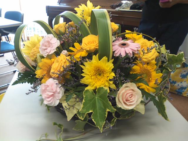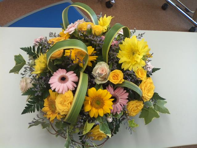 しっかりと留まったらヒマワリの足元にその他の花やグリーンをあしらう。。。そんなナチュラルな、でも個性的なデザインでした。