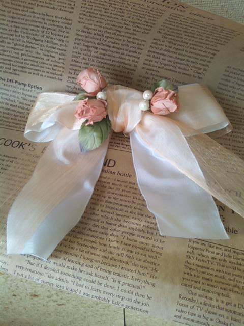 リボンのコサージュはバラ、リーフ、パールを使いました。