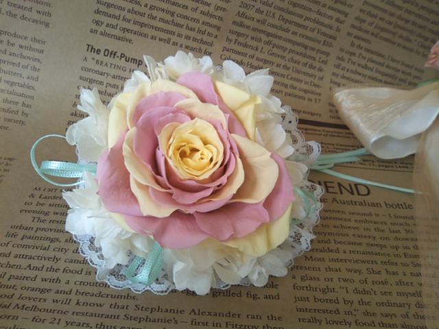 メリアのコサージュはバラのほかに、アジサイとレースリボンを使いました。
