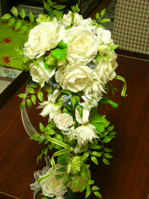 こちらはFさんが作った造花のキャスケードブーケ&ブートニア。