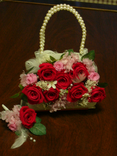 ←Mさんが作ったカラードレス用、プリザーブド。左側にあるのはブートニアです。