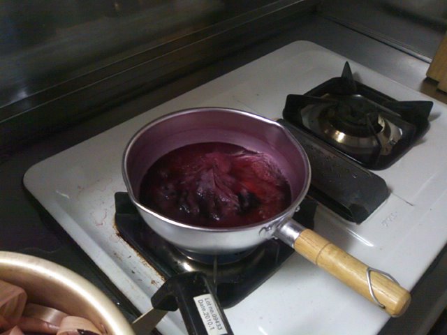 まずは染液を煮出します。これは“コチニール”というカイガラムシを使っています。