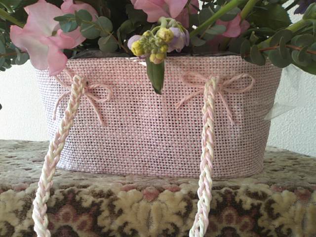 ピンク色のかわいらしいバスケットにアレンジをします。