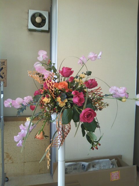 バスケットからあふれ出るような流れを雪やなぎやスイートピーで表現しています。